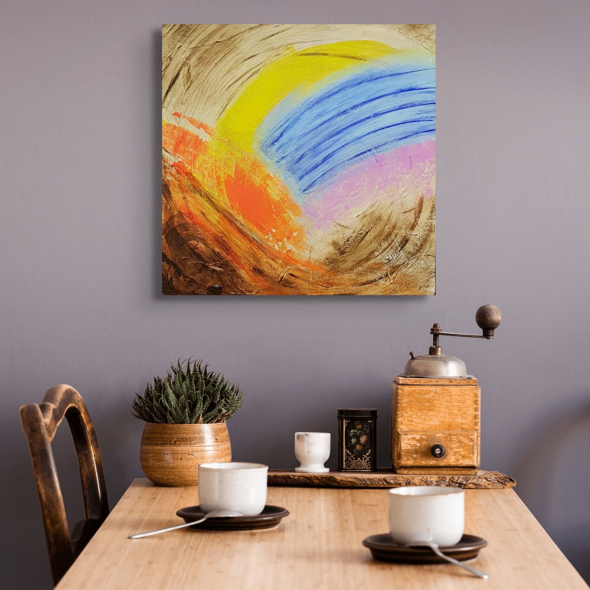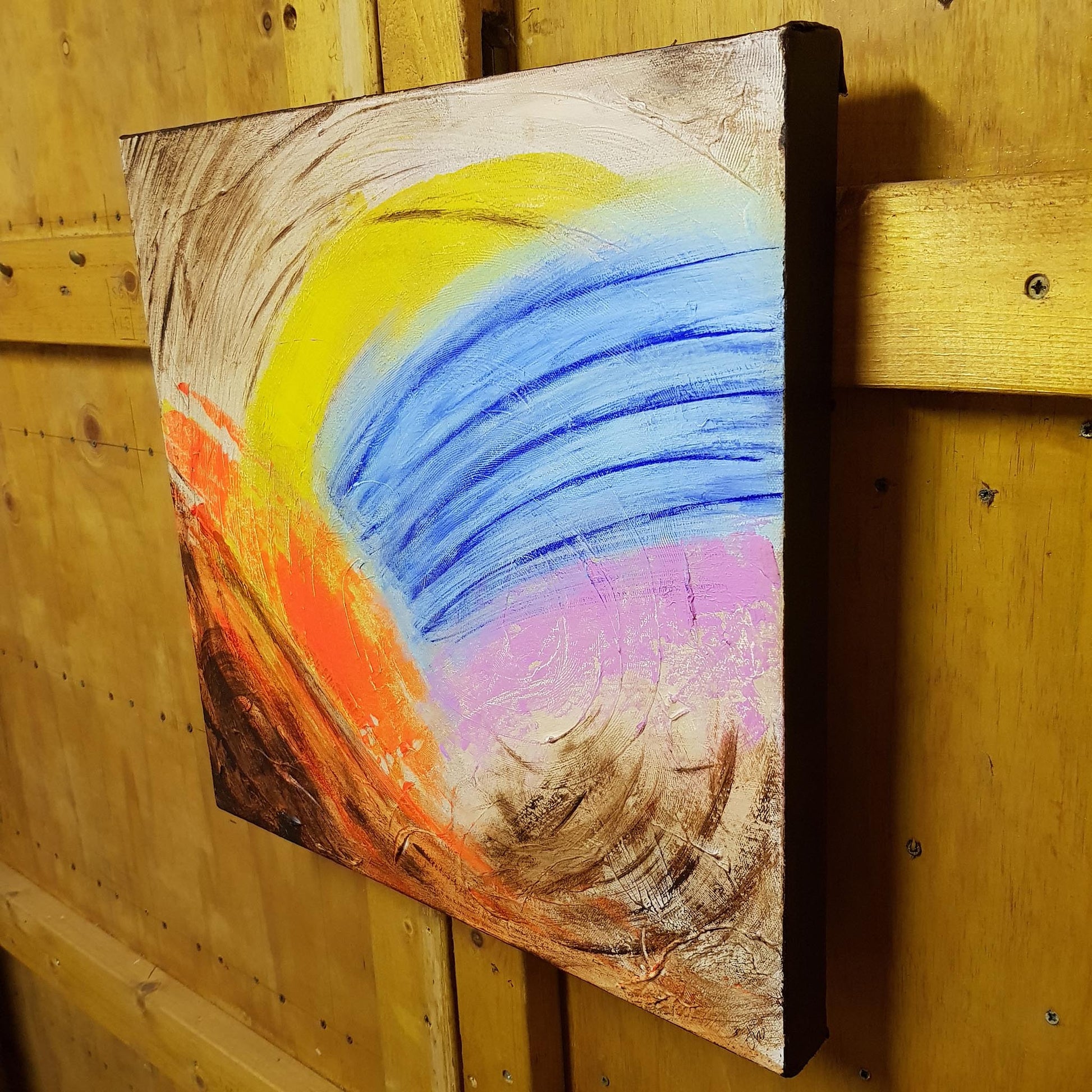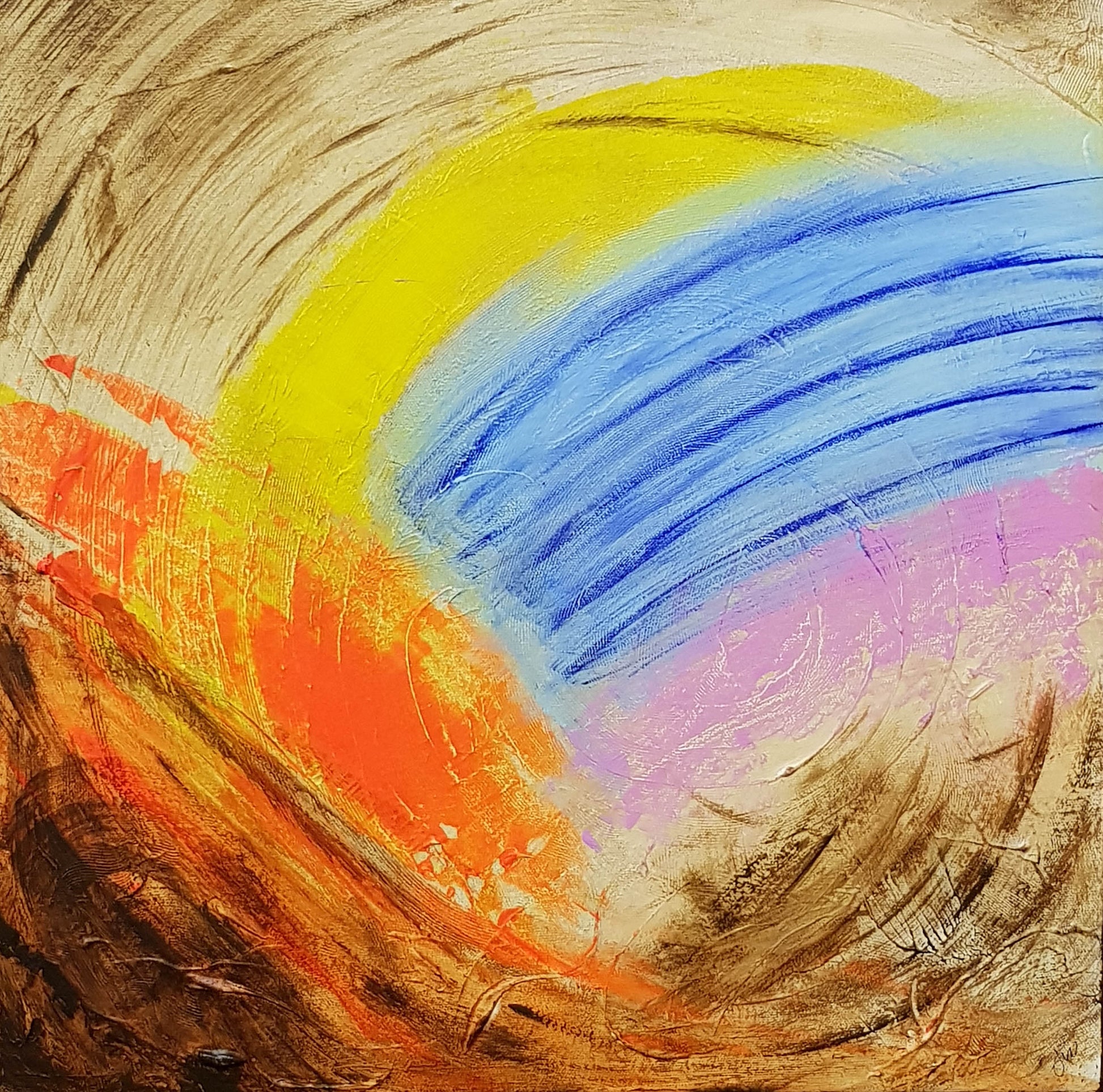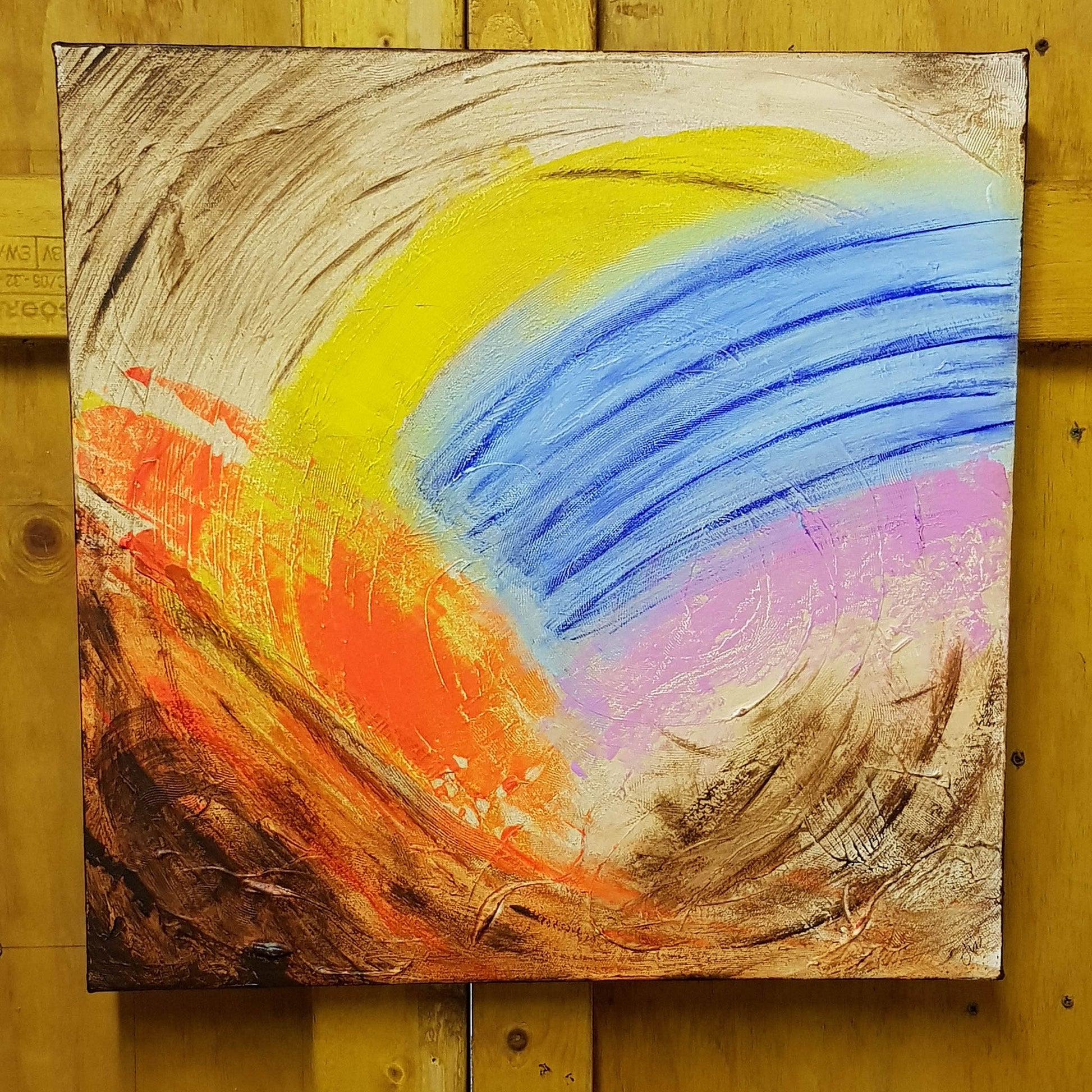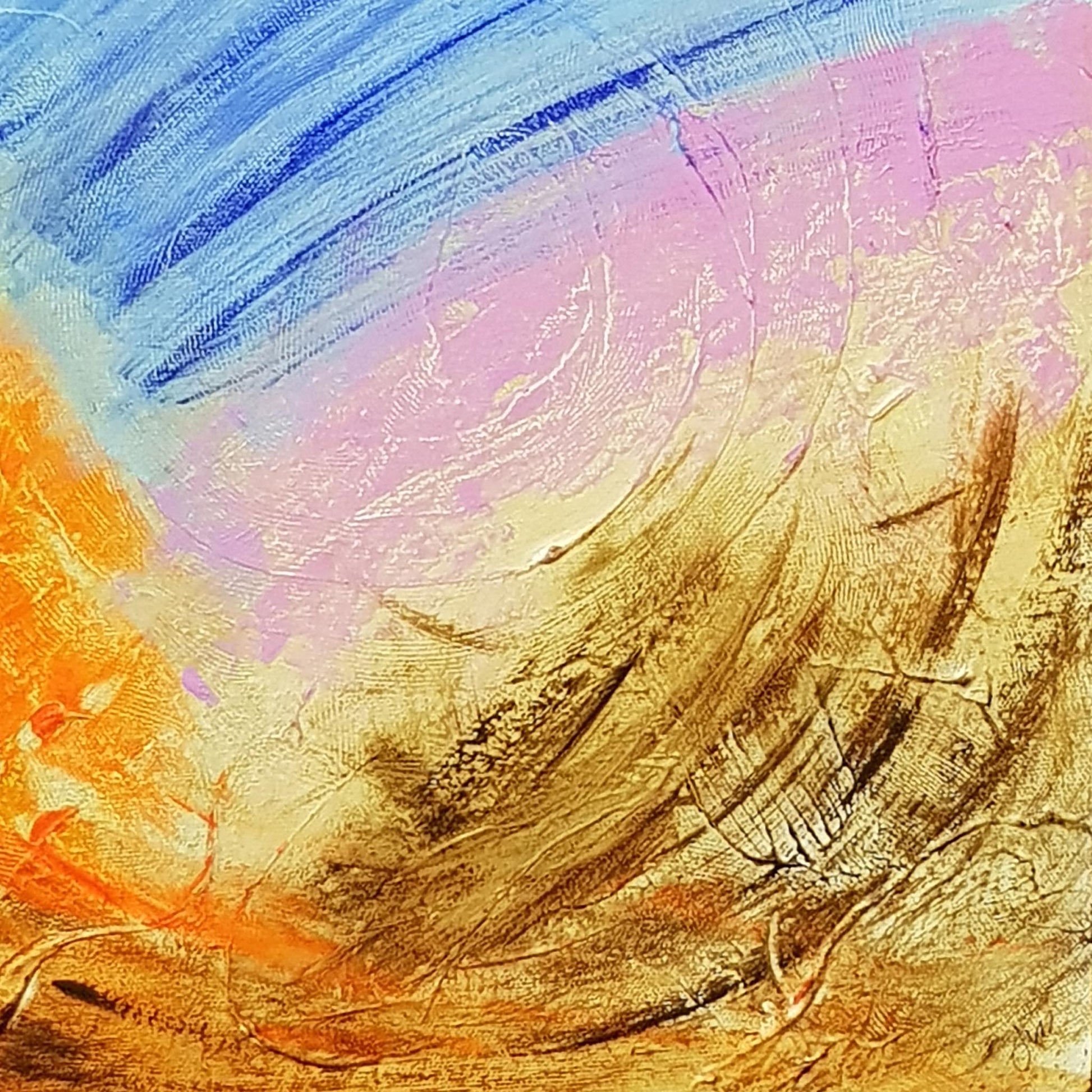 An abstract sunrise. A landscape deconstructed by time. Blue Rising uses a mix of earthy burnt umber and vibrant colors like ultramarine, fluorescent orange, primary cyan, and quinacridone rose pink to create a unique and textured landscape.