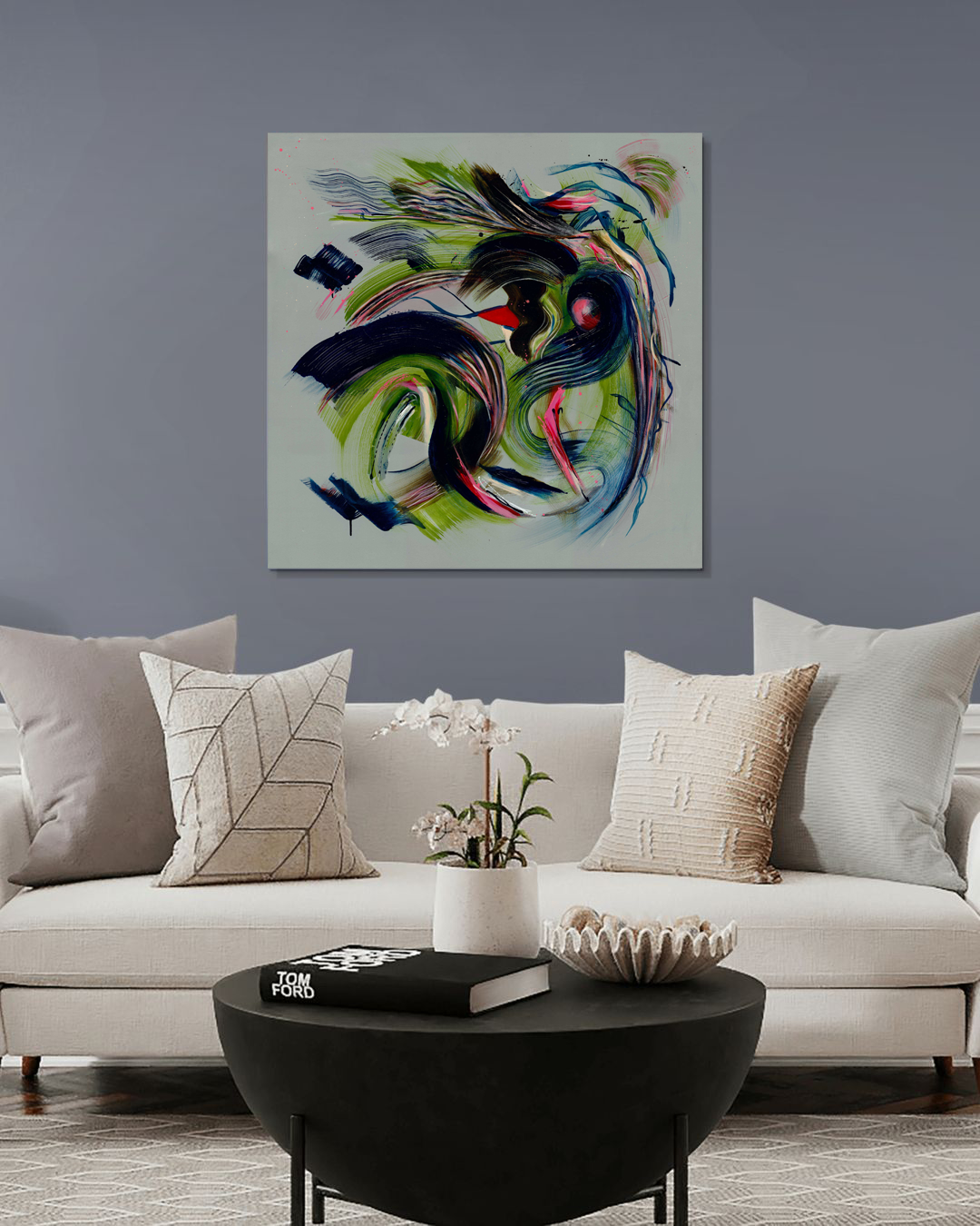 Emerging from the Grey bursts out of the greyness with swirls, spray and intensive colourful gesture. Texture and gestural marks allude to sunrises, natural forms and landscapes, as if nature itself is keen to explode out of the grey.