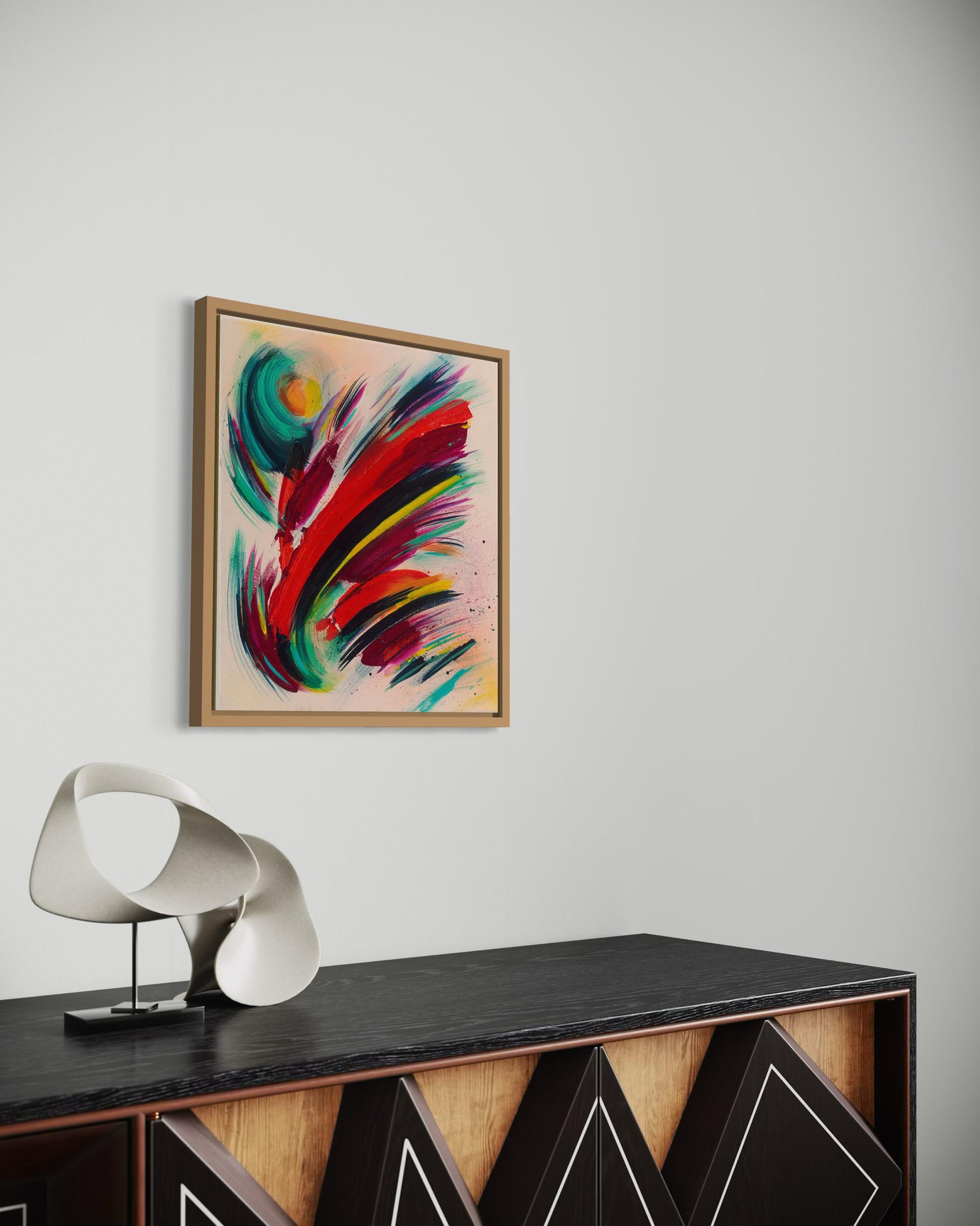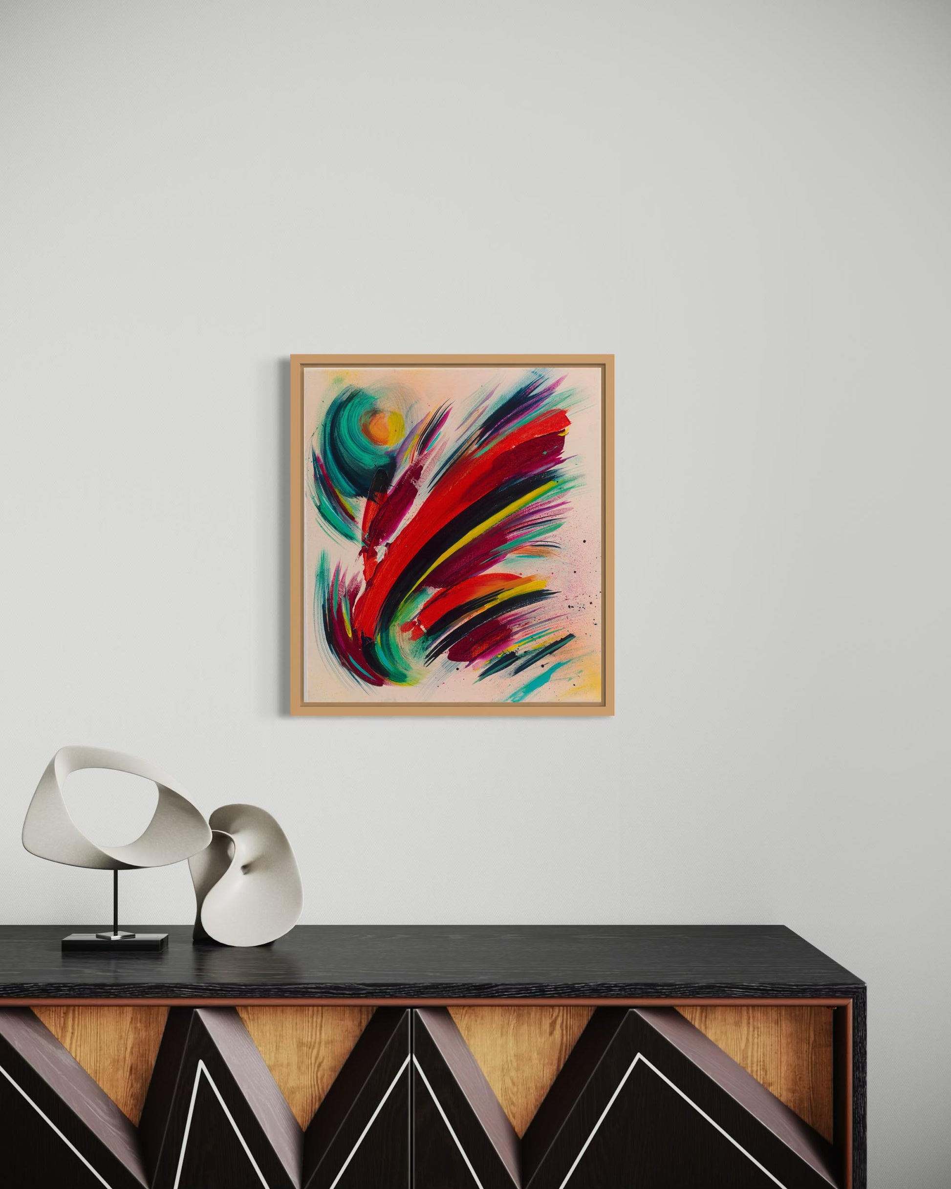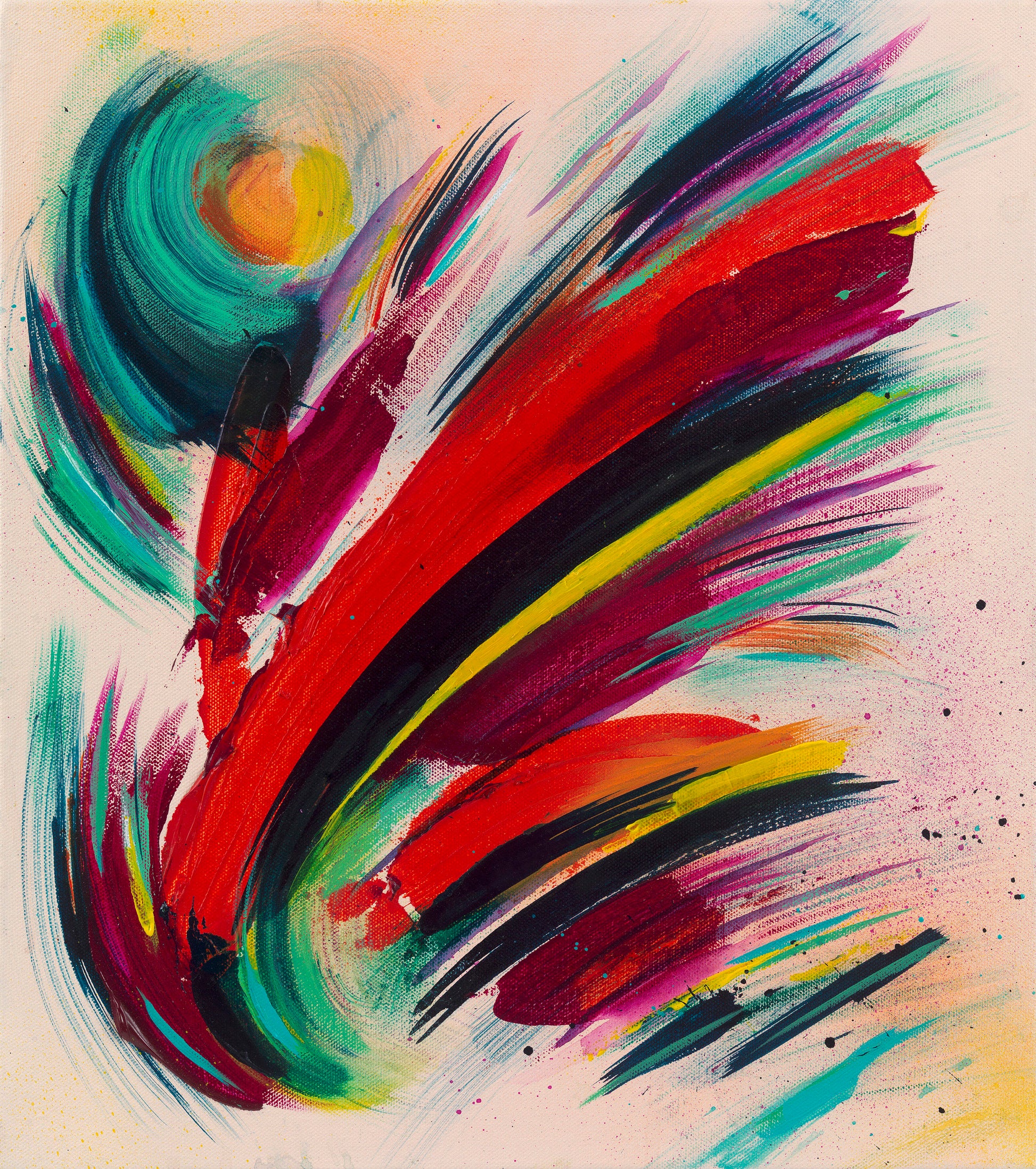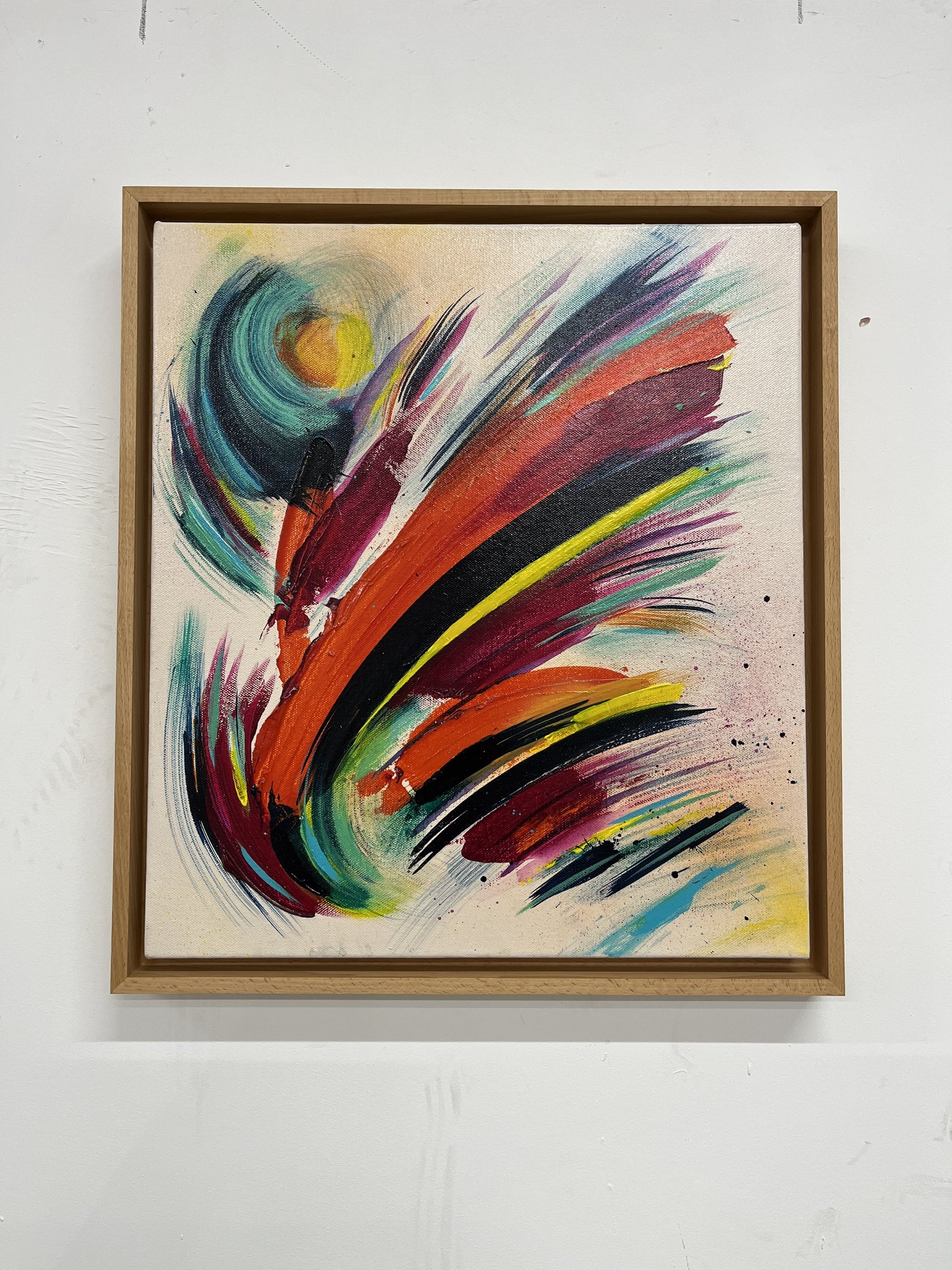 Higher Plane bursts with bright colours, embodying a sense of exploration and transcendence. The expressive brushwork suggests atmospheric movement, inviting viewers to imagine the beauty of distant worlds, while giving a feeling of elevation and adventure, the journey to new heights and the limitless possibilities of the imagination.