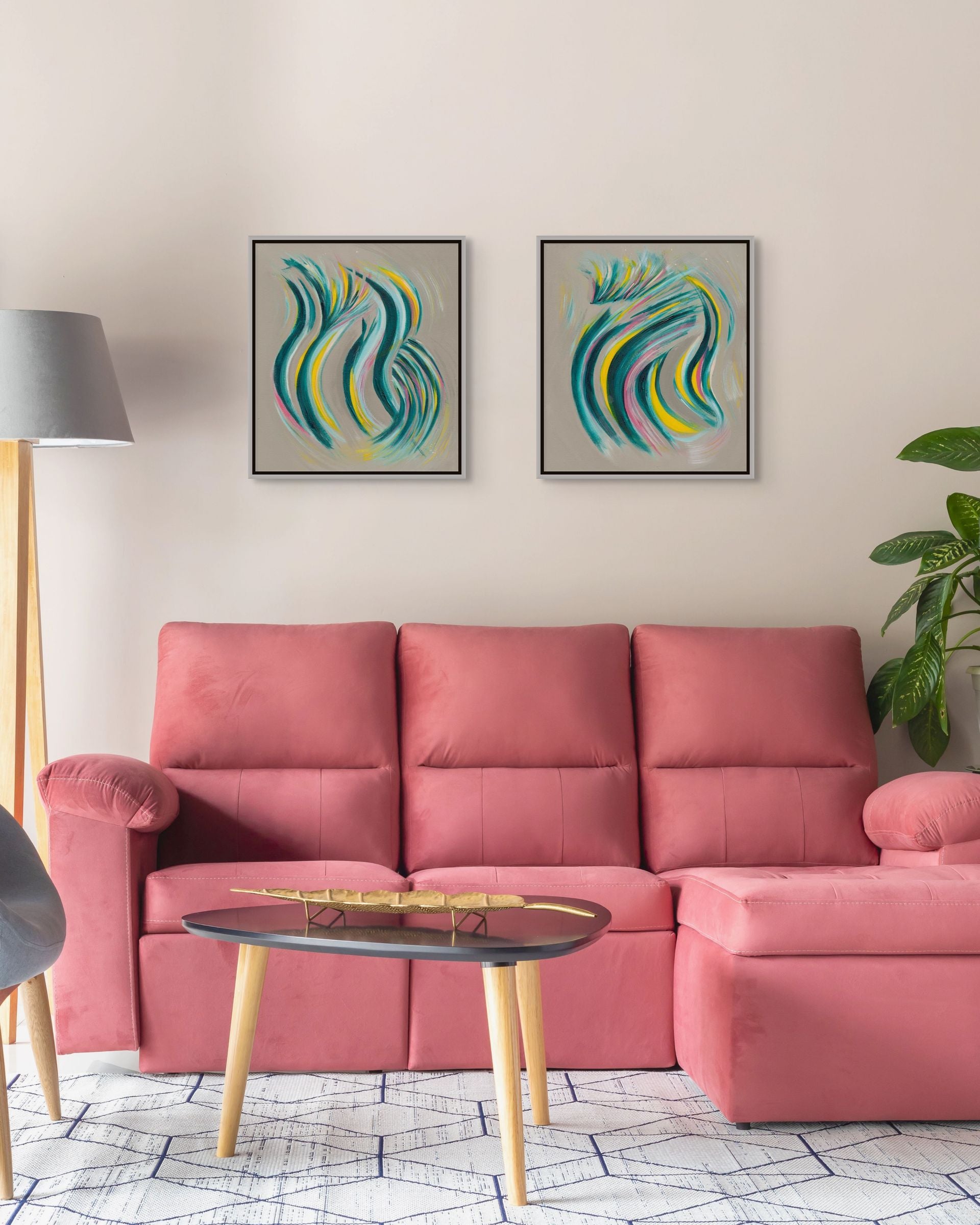 Energy trembles through Shake, where layered marks evoke rhythm, pulse, and release. Colour vibrates against the grey warmth beneath, creating a sense of movement caught mid-beat, as if the canvas itself were dancing.