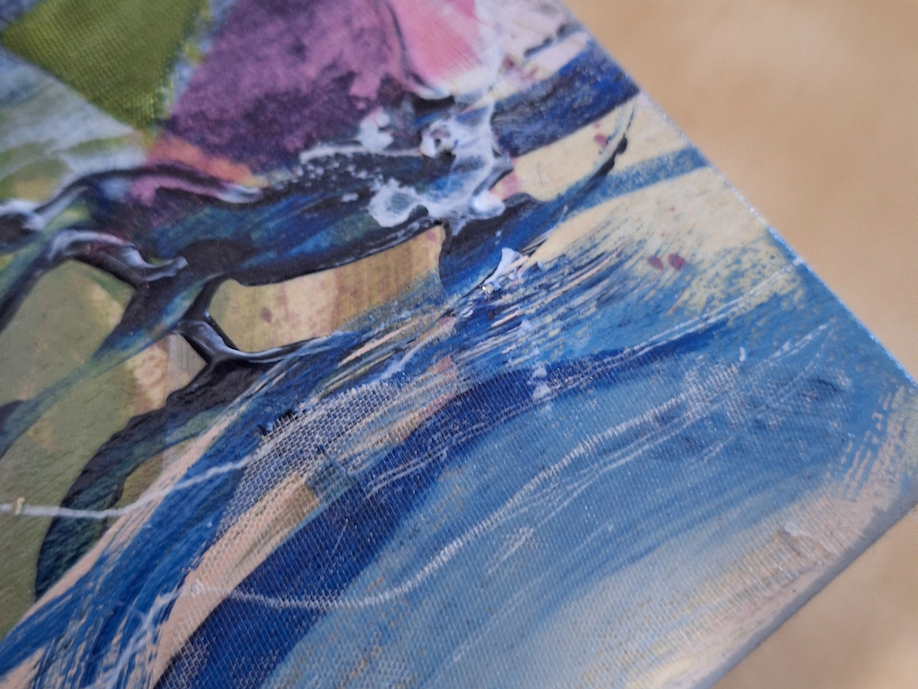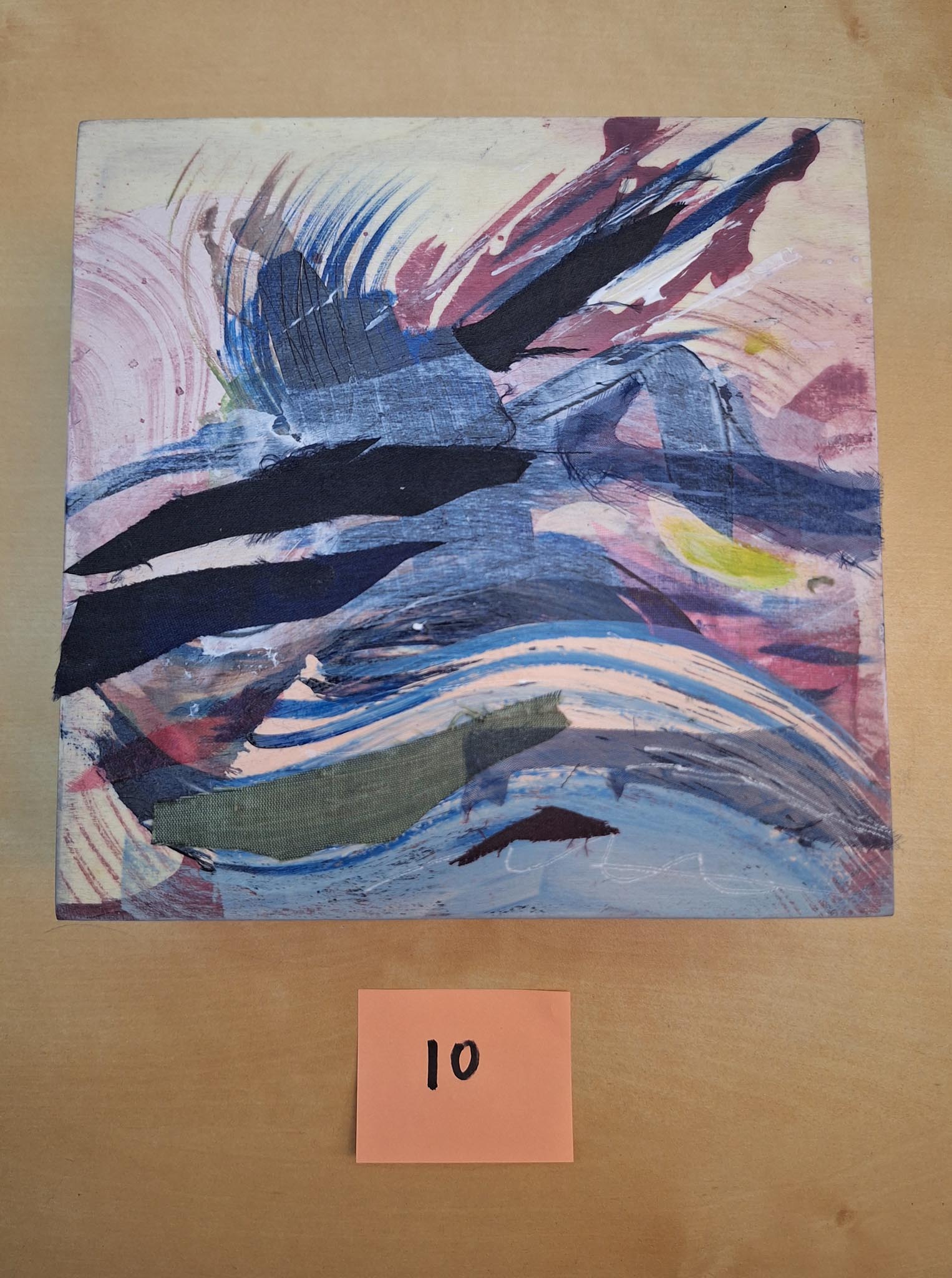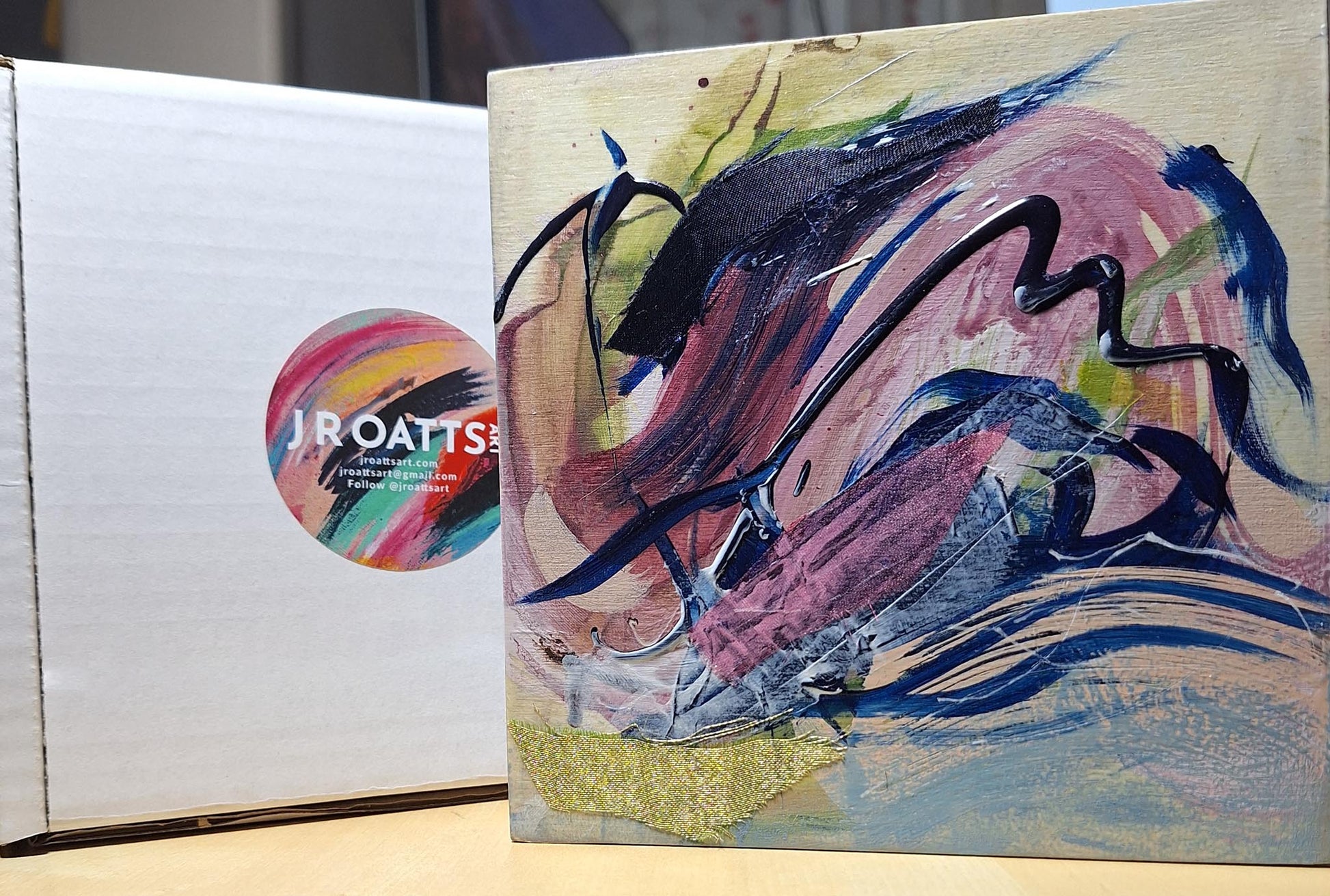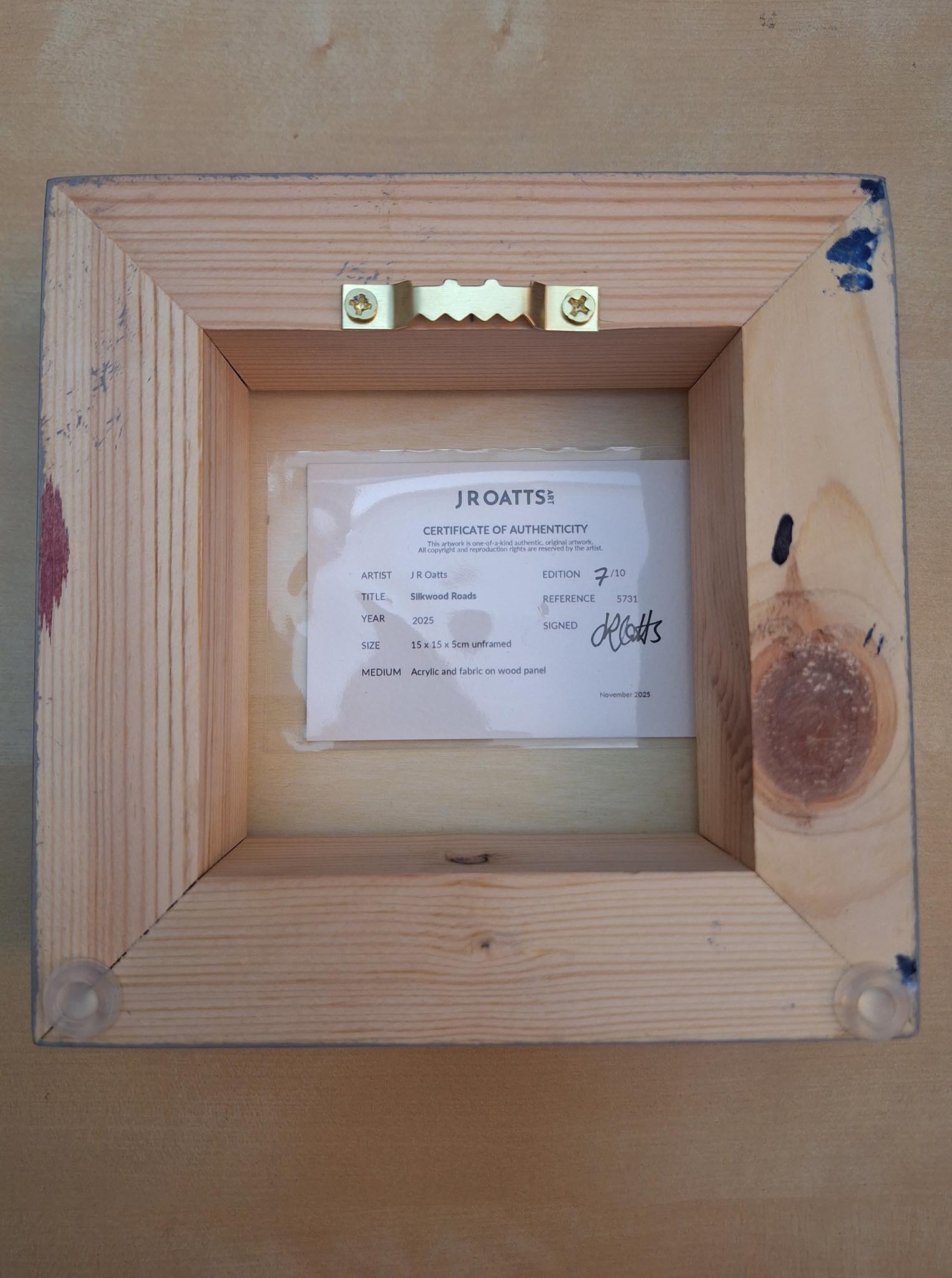 These 10 abstract works are my first works using fabric to ‘paint’ with, alongside acrylic ink and paint. In the past year, I've become fascinated with my local town of Macclesfield's silk heritage. Called Silkwood Roads, these pieces reference the ancient Silk Roads and the wood of the local Holly trees which kickstarted button making in the area – which led to the silk industry being central to Macclesfield.
