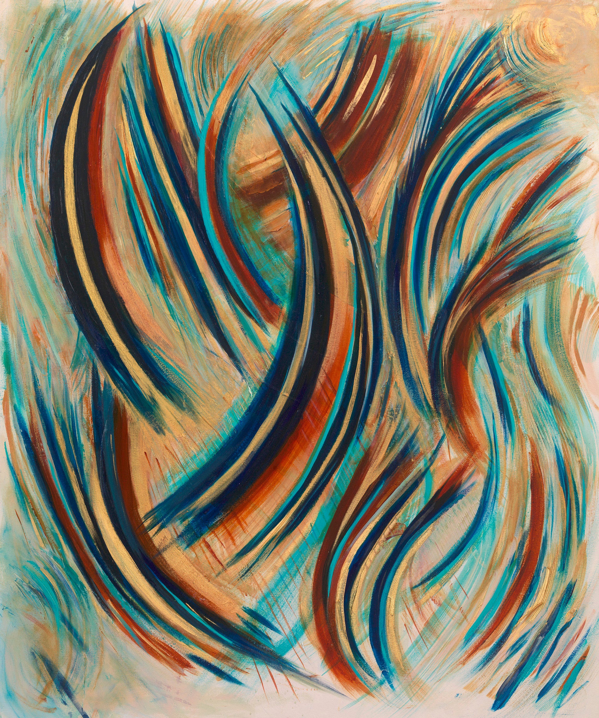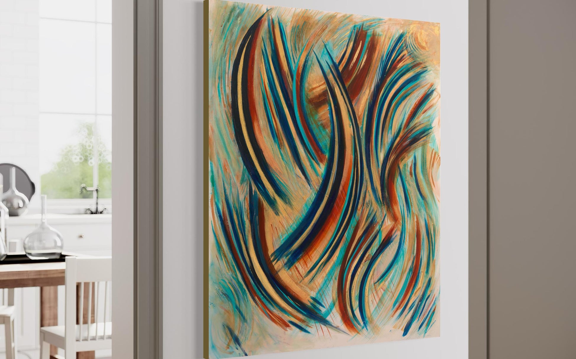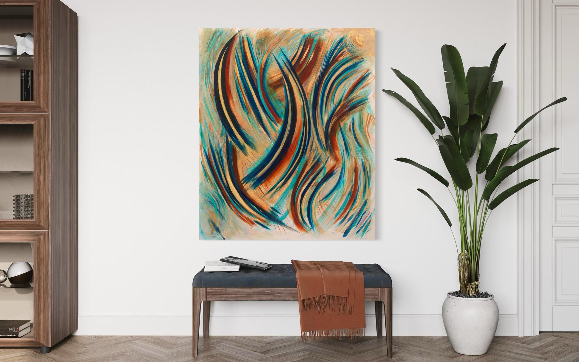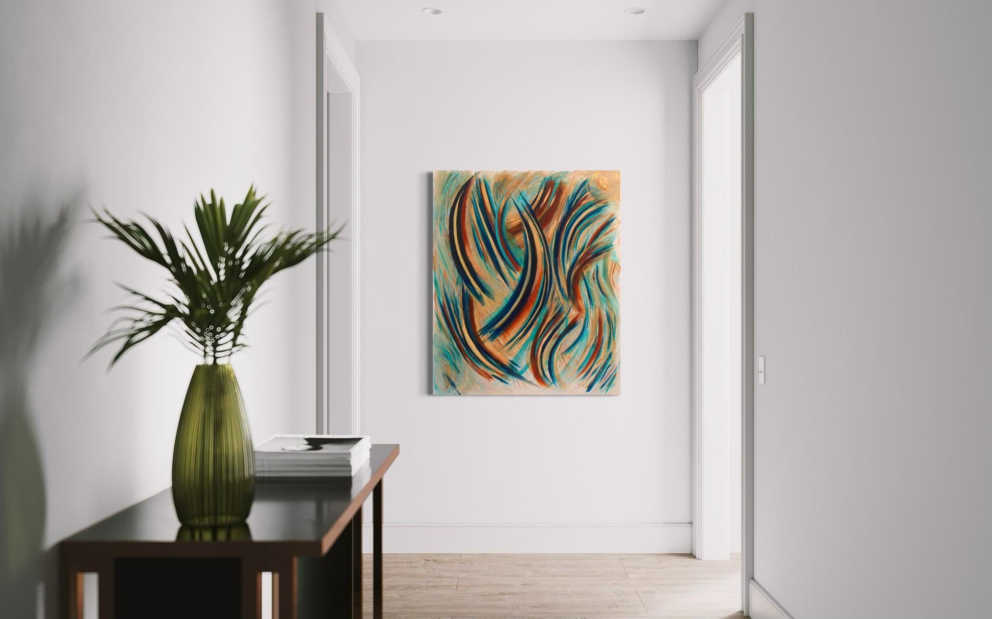 The colours of teal, rust brown and dark blue dance about with glistening gold in a mesmerising rhythm that shouldn't work, but feels so right. Just like a syncopated rhythm.